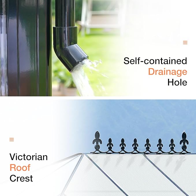 • Walk-in Greenhouse for Better Ventilation: 4.4 FT wide double swing doors (with door hooks) for easy entry to dozers and people. 2 adjustable side vents for air convection. A Victorian roof crest design is added on the top