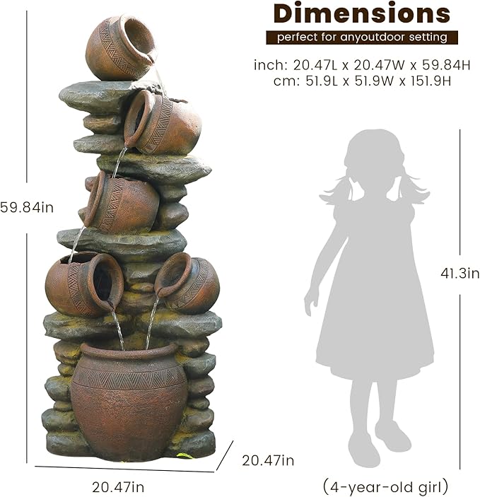 • 【5-Tier Outdoor Waterfall Fountain】 Experience moments of tranquil relaxation! This 59.84-Inch outdoor fountain features gentle cascading water that produces soothing, realistic waterfall sounds. Perfect for your garden, patio, or backyard.