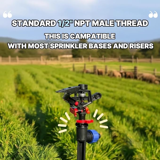 • Package includes one durable 1/2-inch plastic impact sprinkler head. Adjustable spray reaches up to 85 feet and fits 1/2-inch male thread. Built-in splash-control and UV-resistant plastic ensure durability. 0–360° adjustable rotation offers flexible watering patterns. Works well in tough conditions—great for lawns and gardens.