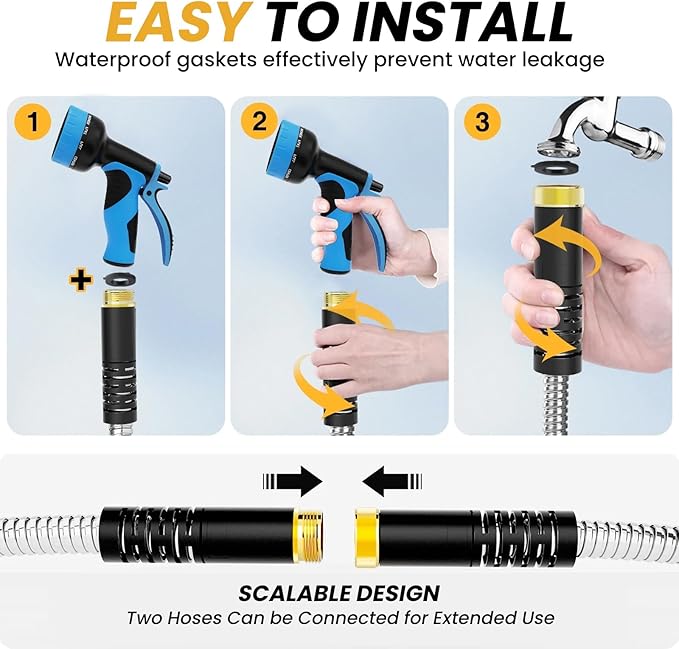 - 【Flexible and Kink Free, Easy Lefree】- Metal garden hose features a spiral interlink design, metal hose cover is tightly connected so that no matter how much the hose is pulled,the inner tube stays in place, it effectively prevents kinks and allows for easy coiling and maneuvering. Flexible water hose is easier to handle and lighter in weight compared to traditional hoses.