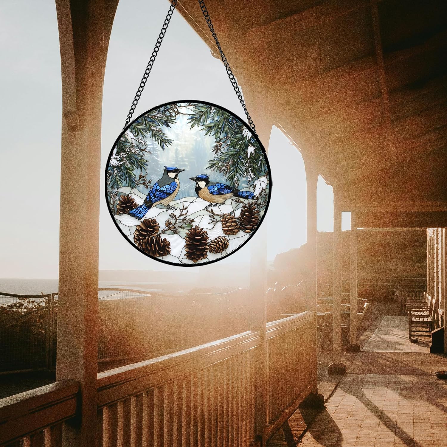 Stained Glass Window Hanging - Blue Bird Winter Forest Landscape Suncatcher for Door Garden Yard Sun Catchers Decor Christmas Mother's Day Birthday Gifts for Women Mom Nana Friend 9.8 in