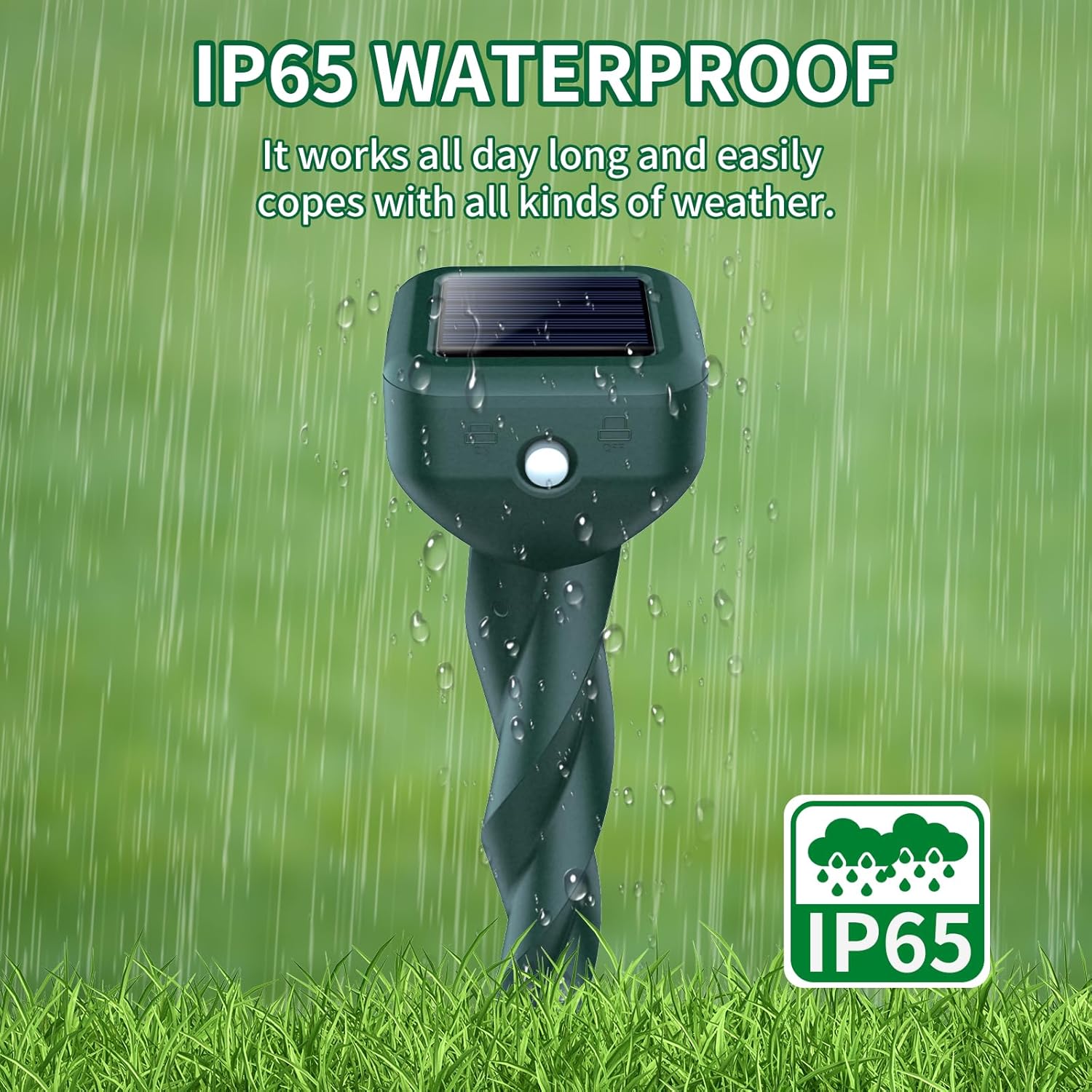 • Effective Repellent: This ultrasonic repellent uses solar-powered Ultrasonic &vibrations Dual Technology to deter Mole, Snake,Rabbit, Gopher, Vole, Skunk, Chipmunk, Deer, Groundhog, Armadillo, and Raccoon from your Lawns Gardens Yards, Farms,Orchard.