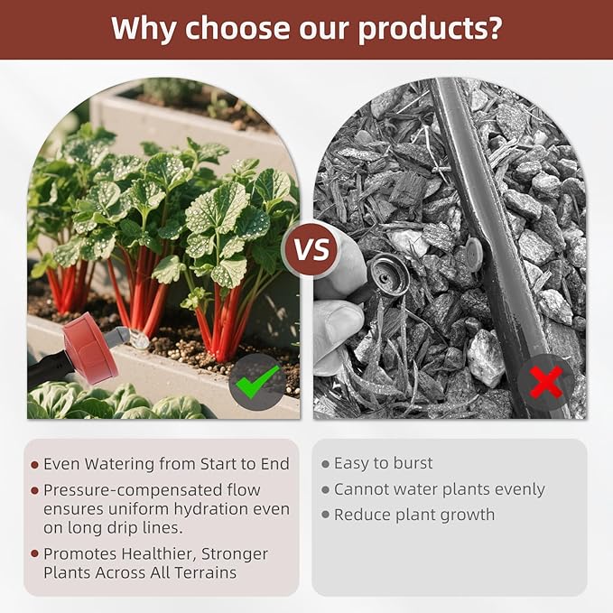 • Custom Flow Rates for Every Plant Type: Available in 0.25 GPH, 0.5 GPH, 0.75 GPH, 1 GPH, and 2 GPH options. Choose low flow for delicate flowers, medium for vegetables, and higher flow for trees or shrubs. Optimize water delivery to each plant’s unique needs. !!! CHOOSE pressure-compensating drip irrigation emitters FROM 【Spalolen】!!!