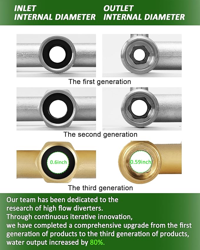 • 0.59-INCH LARGE BALL VALVE ALLOWS RESTRICTIONLESS WATER FLOW: Aware of 3/4-inch pipe limitations, we balanced sturdiness and increased flow. The water hose splitter body features a 0.1-inch wall thickness, a 0.6-inch inner diameter, with a tested pressure of 2.4 MPa, and the flow rate at each outlet is 3.38 pounds per second