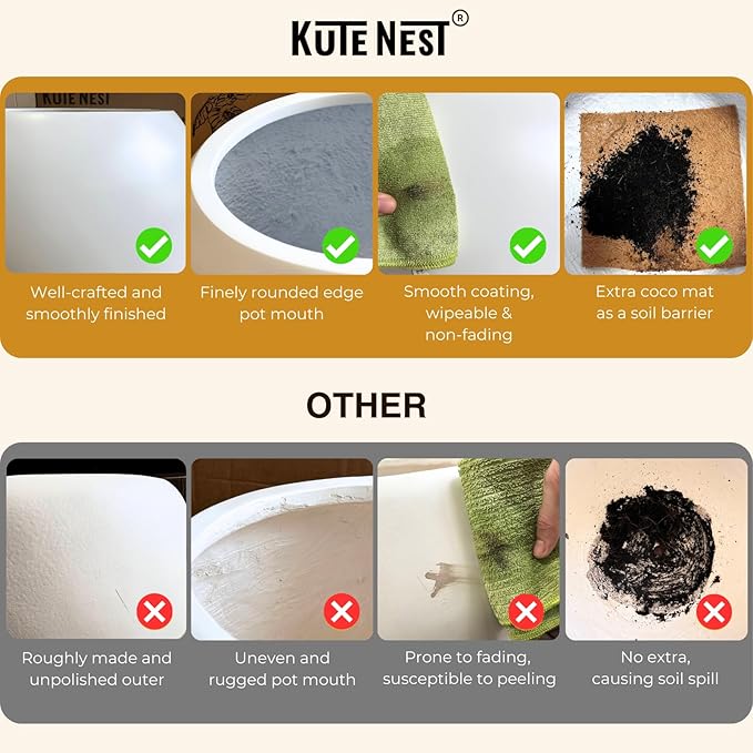 • 𝐖𝐄𝐀𝐓𝐇𝐄𝐑 π‘π„π’πˆπ’π“π€ππ“: With the unique feature of contract-grade fiberstone, KUTE NEST planters for indoor plants are weather-resistant, with rare issues like cracking or fading. Fiberstone planters are also easy to maintain, requiring minimal effort to keep your tall planters for indoor plants, round planters, or large pots pristine over time.