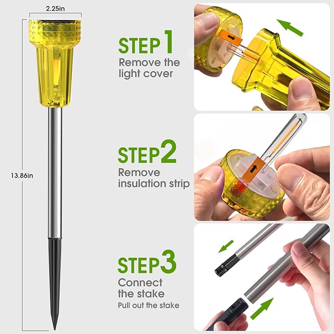 • 3-step installation: Charge 8h → Remove insulation tab → Stake into soil/grass/gravel.Line pumpkin patches, haunted paths, or foggy graveyards in minutes!​Important Prep :​​① Peel off solar panel film ② Charge 8hrs pre-first fright-night③ Remove the insulation piece before use.