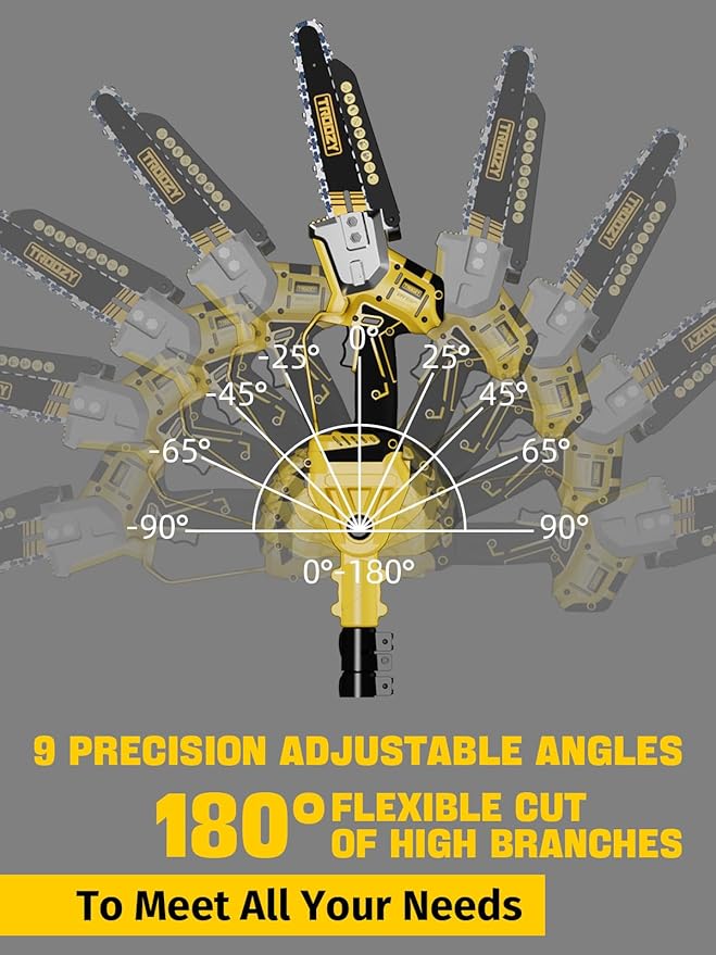 • ๐ŸŒณ ๐—ฆ๐— ๐—”๐—ฅ๐—ง ๐—”๐—ก๐—š๐—Ÿ๐—˜ ๐—”๐——๐—๐—จ๐—ฆ๐—ง๐— ๐—˜๐—ก๐—ง: Lock the pole at any angle 0-180ยฐ for cutting in tight spaces. Rotate vertically/horizontally to avoi d ladder risks โ€“ trim branches like a pro!
