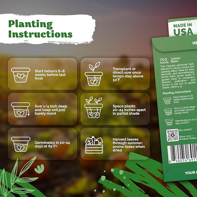 • High Germination Rate: organic lemon balm seeds sprout in 10-14 days at 65 °F when barely covered (1/4" deep max) and lightly misted with 20–24" spacing. Perfect for USDA zones 4-9 outdoor garden, beds and indoor garden pots.