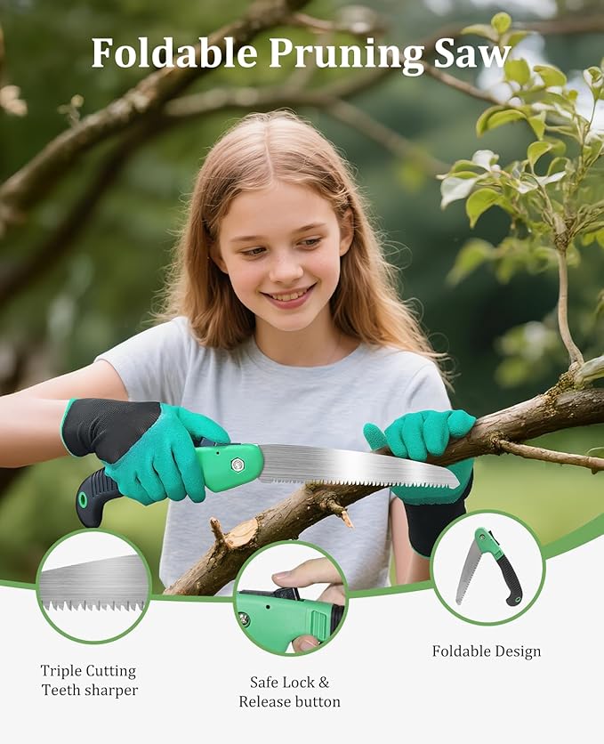 • 【10-in-1 Garden Tools For Gardening】Meet all your gardening needs! It comes with a garden tote bag, pruning saw, weeding knife, trowel, hand rake, cultivator, weeder, pruner, spray bottle and garden gloves. All gardening supplies are made from eco-friendly and non-toxic materials, providing you with a safe and worry-free gardening experience