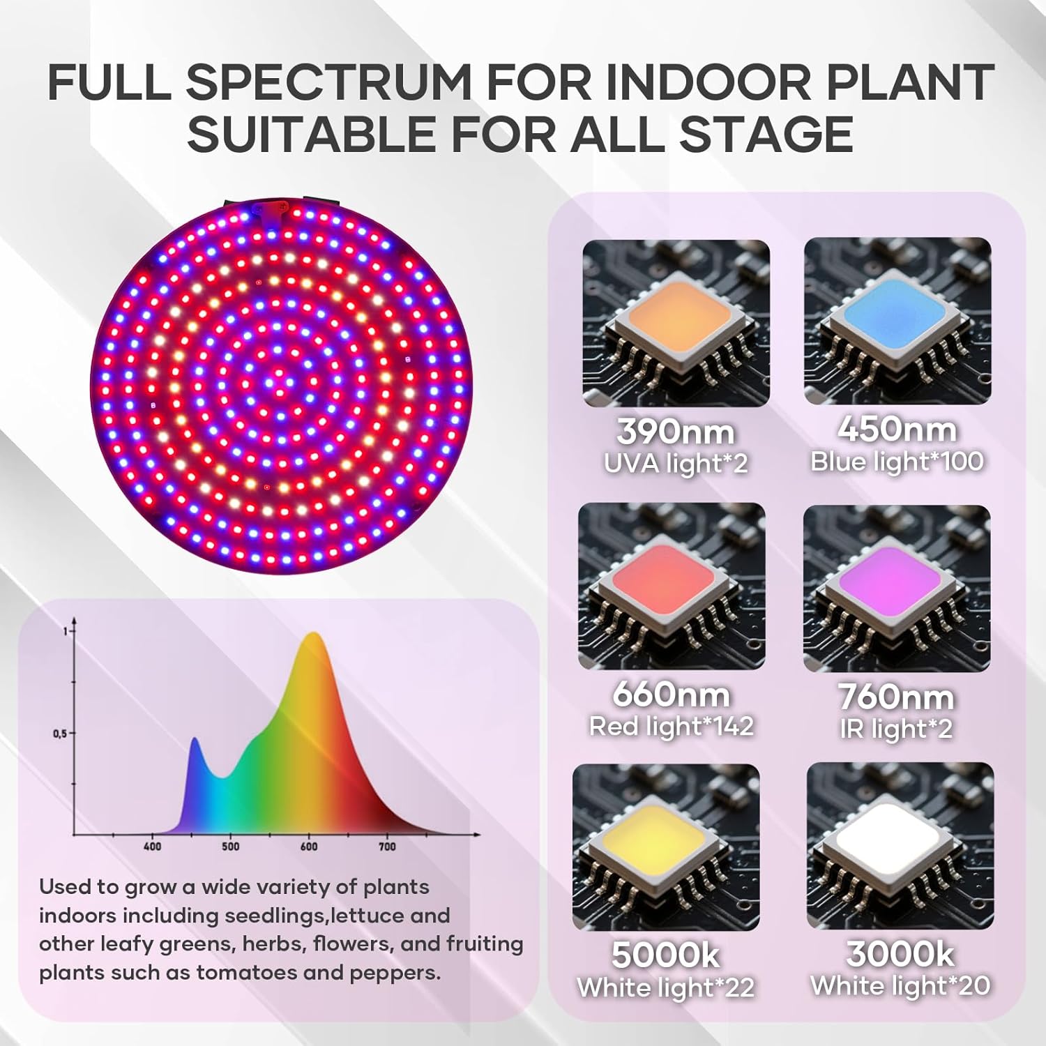 • 288 LEDs Full Spectrum : This grow light features 288 high-performance LED beads, includes 3000K, 5000K, 660nm, 760nm,UV-IR LEDs,3000K and 5000K diodes provide more reddish and blueish light.this innovative plant light provides a full spectrum light.It serves as an suitable light source for plant growth and can help plants promote efficient photosynthesis.