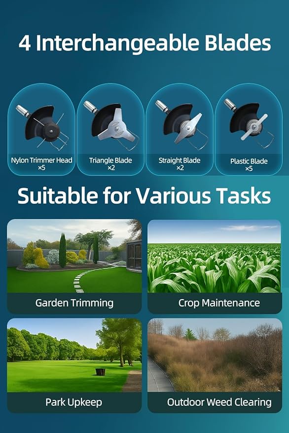 • 【Multifunctional Blades for Different Scenarios】This string trimmer, uses the nylon trimmer head as its core cutting accessory. Cuts efficiently at the roots of weeds, quickly clearing large areas. It also comes with 3 interchangeable specialized blades (only one installed at a time, easily switched with the nylon head): a triangular blade for tough weeds and small shrubs, a straight blade for clean lawn edging, and a plastic blade that protects seedlings when trimming around them.