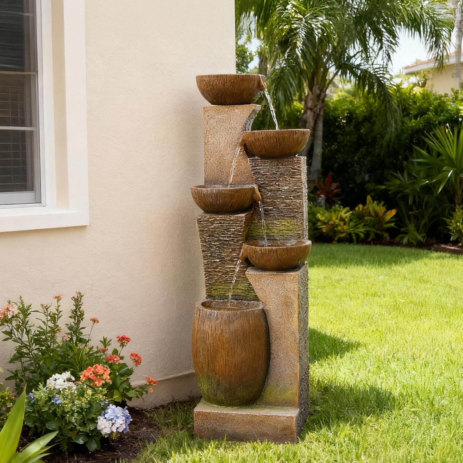 51.4" H Large Water Fountain Outdoor&Indoor, 5-Tiers Cascading Modern Feature Crocks Garden Fountains and Waterfalls with Warm Lights for Porch, Deck, Patio, Home Décor (Brown)