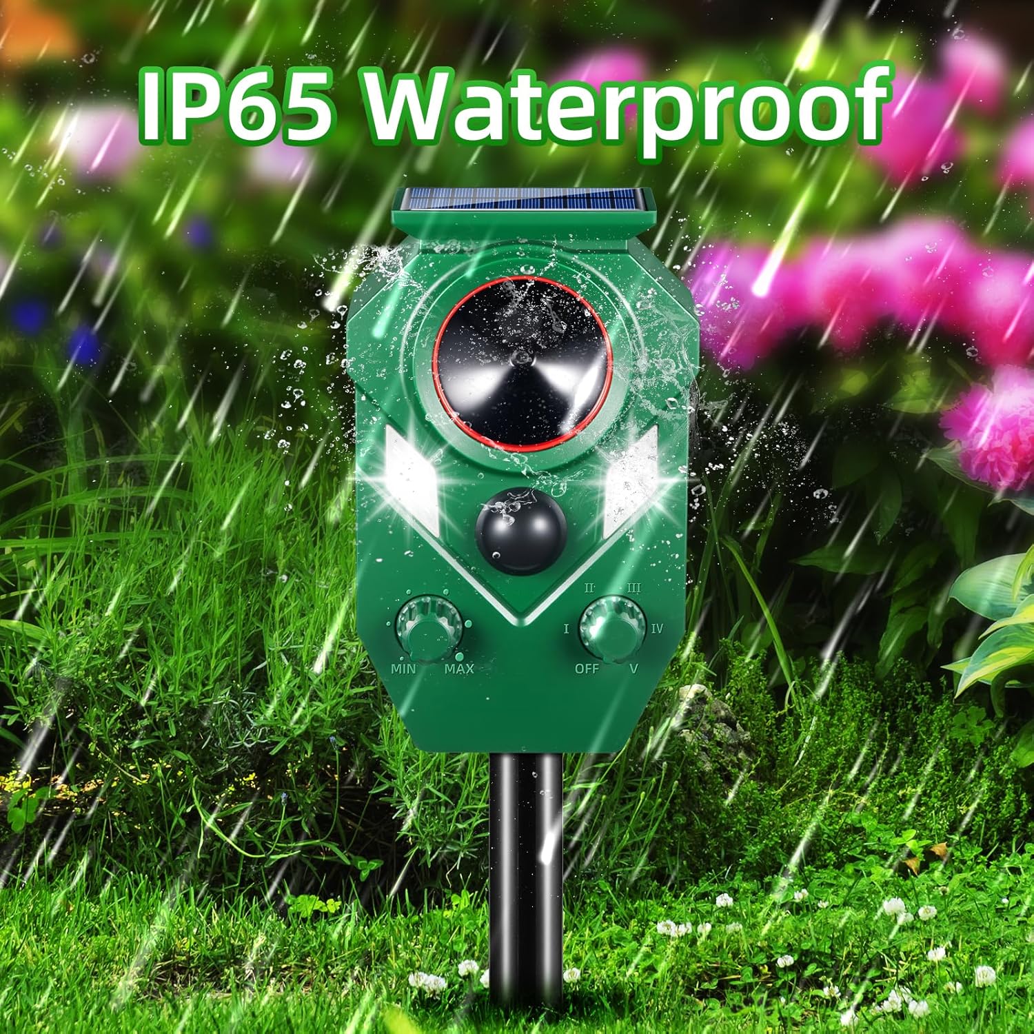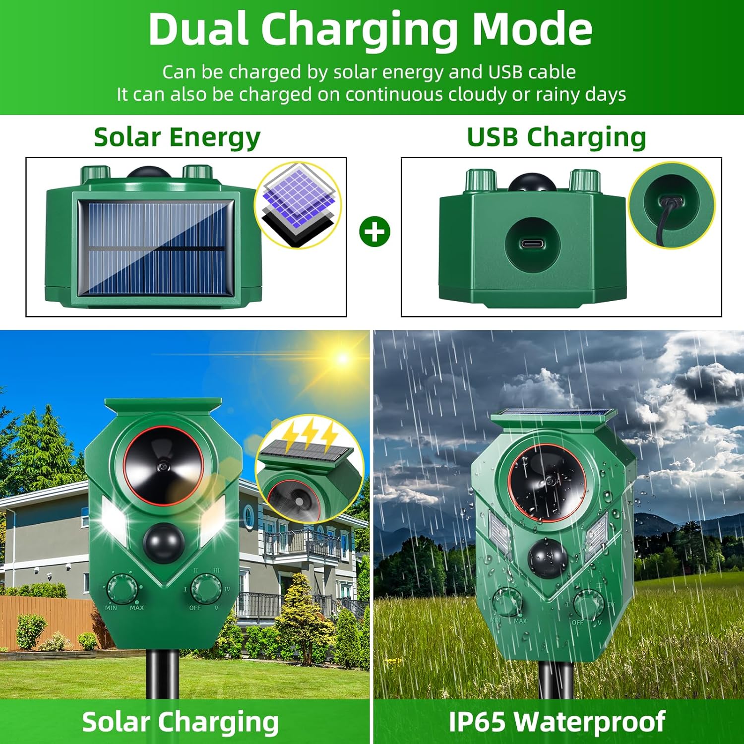 • Dual Charging for All-Weather Use: Features solar and USB charging for uninterrupted operation, even on cloudy days. Designed for outdoor functionality, the squirrel repellent works efficiently during the day, night, and light rain. Perfect for maintaining gardens year-round