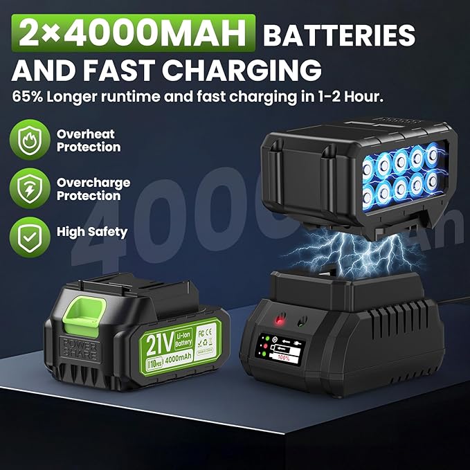 - ๐2X 4.0AH BATTERIES FOR EXTENDED RUN TIME: Never run out of power! Our electric leaf blower includes two 21V 4000mAh batteries and a fast charger, delivering extended runtime even for large yards. Use one while charging the other for uninterrupted cleaning. Minimize downtime and maximize productivity! Both batteries deliver up to 10+ minutes of runtime at maximum speed. Equipped with overheat protection for safe, reliable operation.