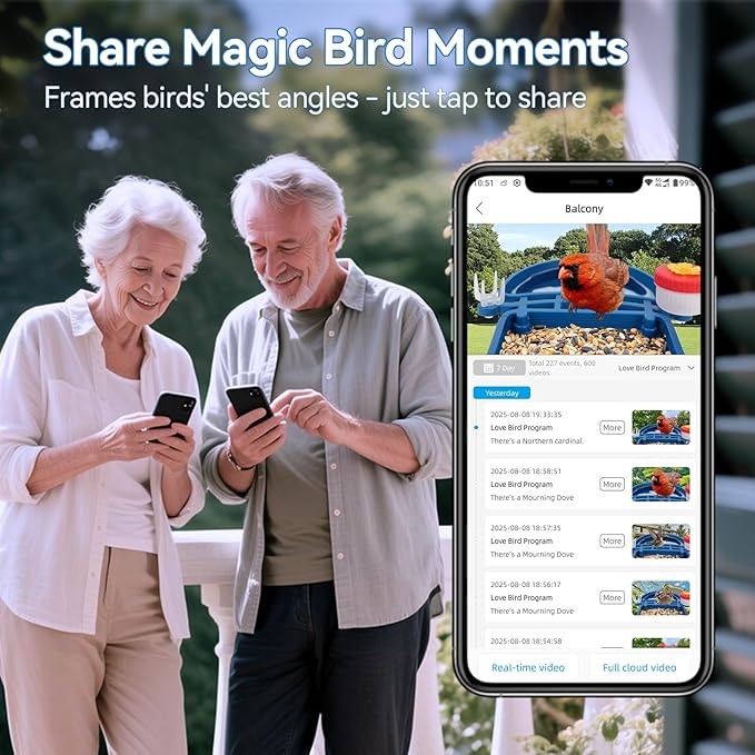 • Bird Watching Brings Us Together - This smart bird camera saves videos in the cloud (cloud storage needs subscription) or on a memory card (you can use any standard SD card). The bird feeder app lets you share fun bird videos and identify bird types. Show your favorite clips on social media or send them straight to family and friends! Perfect for grandparents to share special bird moments anytime, bringing loved ones closer through nature's beauty