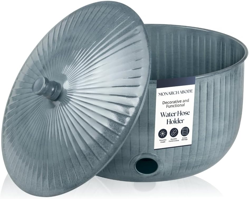 • DECORATIVE & FUNCTIONAL HOSE STORAGE POT: Elevate your yard with this garden hose pot with lid – designed to keep your space tidy while adding curb appeal. Holds up to a 100 ft water hose and blends beautifully with outdoor décor.