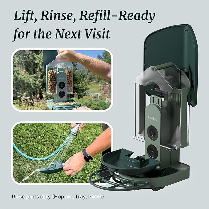 - REFILL IN SECONDS & ATTRACT MORE BIRDS - Push the button—solar roof pops up and the clear 1.5L hopper lifts completely out for fast, no‑mess refills (no straining or awkward pouring). Transparent walls show the seed level at a glance, so you top up on time. Dual seed chambers let you offer different mixes to draw more bird species, and the built‑in food valve helps control seed flow. An easy refill bird feeder with camera for outside that keeps birds coming back.