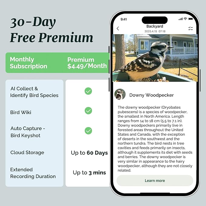 - UNLOCK MORE MAGIC BIRDS - Comes ready with customer support & 1‑year warranty. Want to see even more? Try the optional Premium free for 30 days (then $4.49/mo). Smart AI spots, logs & builds a gallery from 10K+ bird species—tap any visitor for fast facts, habits & range. Auto Keyshots catch great poses. Supports both Micro SD card(up to 128 GB, Micro SD card not included)and cloud storage, ensuring you never miss a scene.