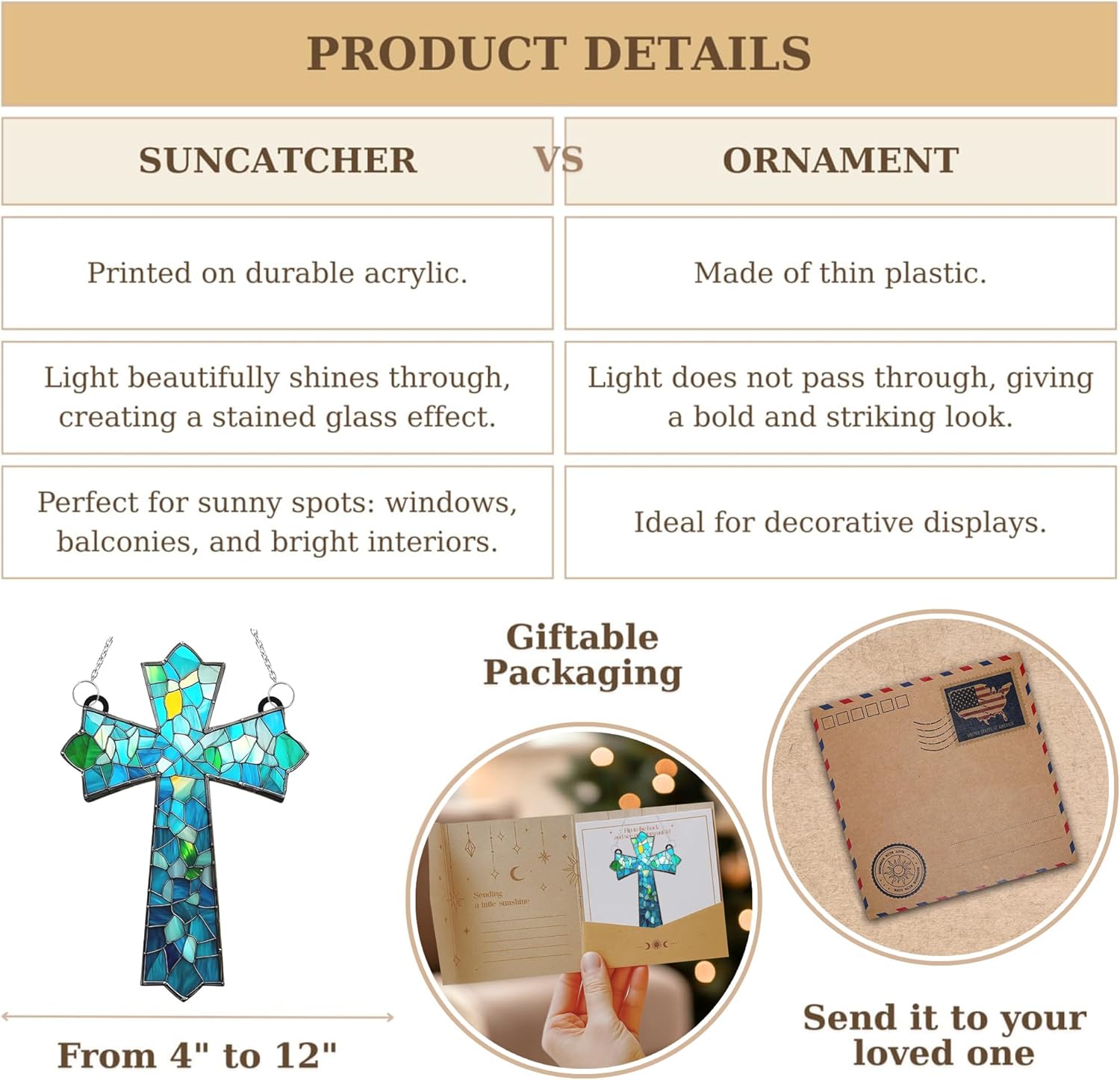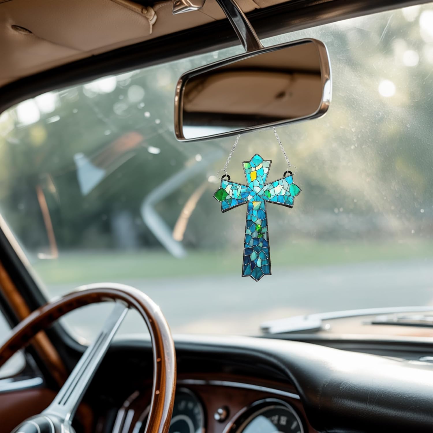 Mosaic Cross Acrylic Suncatcher Stained Glass Effect Window Car Hanging Christmas Ornament Indoor Outdoor Decor Garden Jesus Sun Catcher Panels for Family Christmas Jesus Gift for Women Mom Grandma