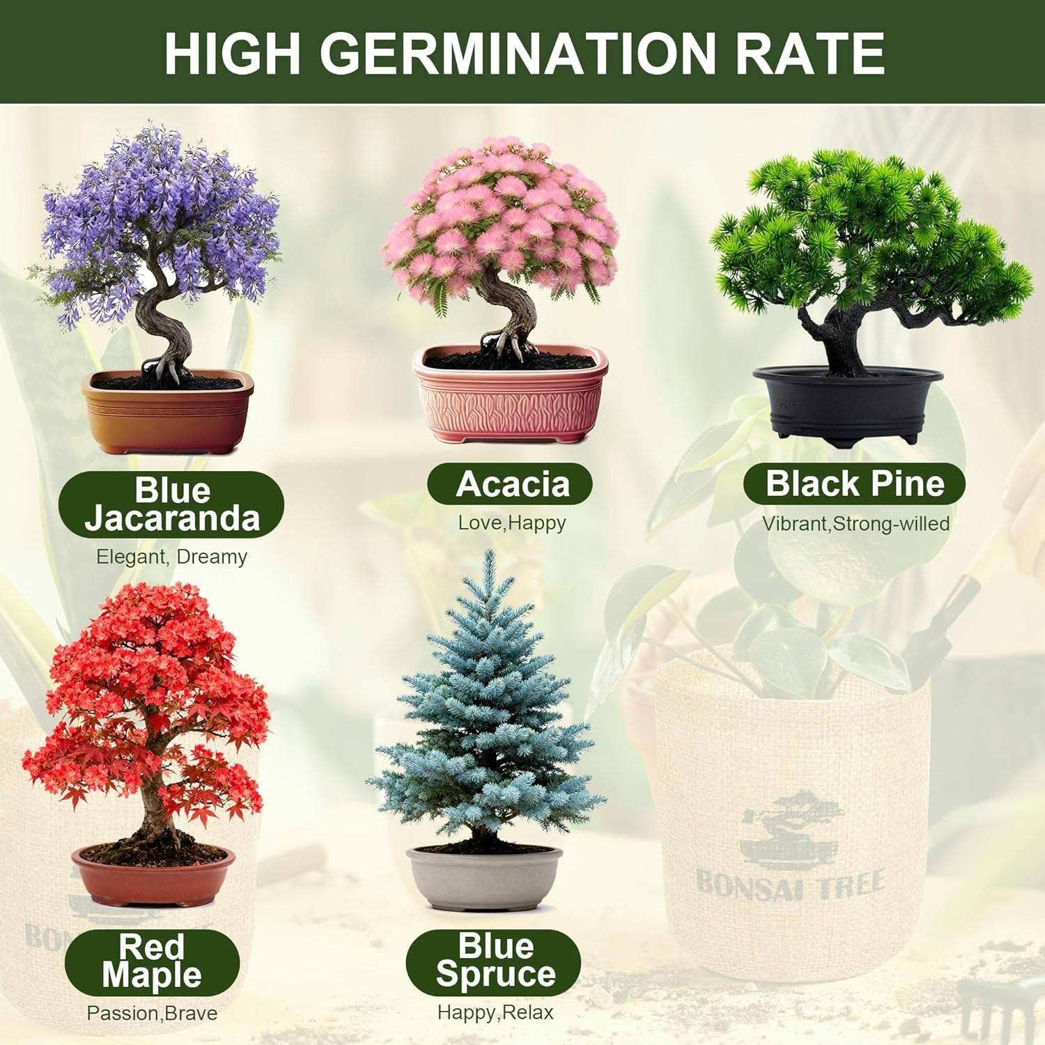 • GROW 5 UNIQUE BONSAI TREE: Do you want a charmful indoor garden? There are 5 popular Japanese bonsai tree seeds: Blue Jacaranda, Acacia, Black Pine, Red Maple, Blue Spruce. They will color your indoor garden. They are easy to plant and nurture. Let's start an exciting botanical journey