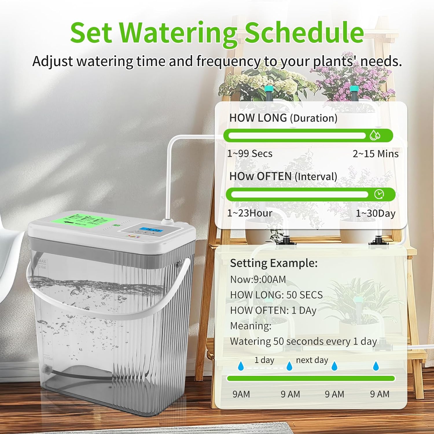 • 【Timed Drip Irrigation System】 LCD screen interface, single watering time can be set 1-99 seconds /2-15 minutes, watering interval can be set 1-23 hours /1-30 days. Once programmed, the Settings are automatically stored in the internal memory, even if the power is off.