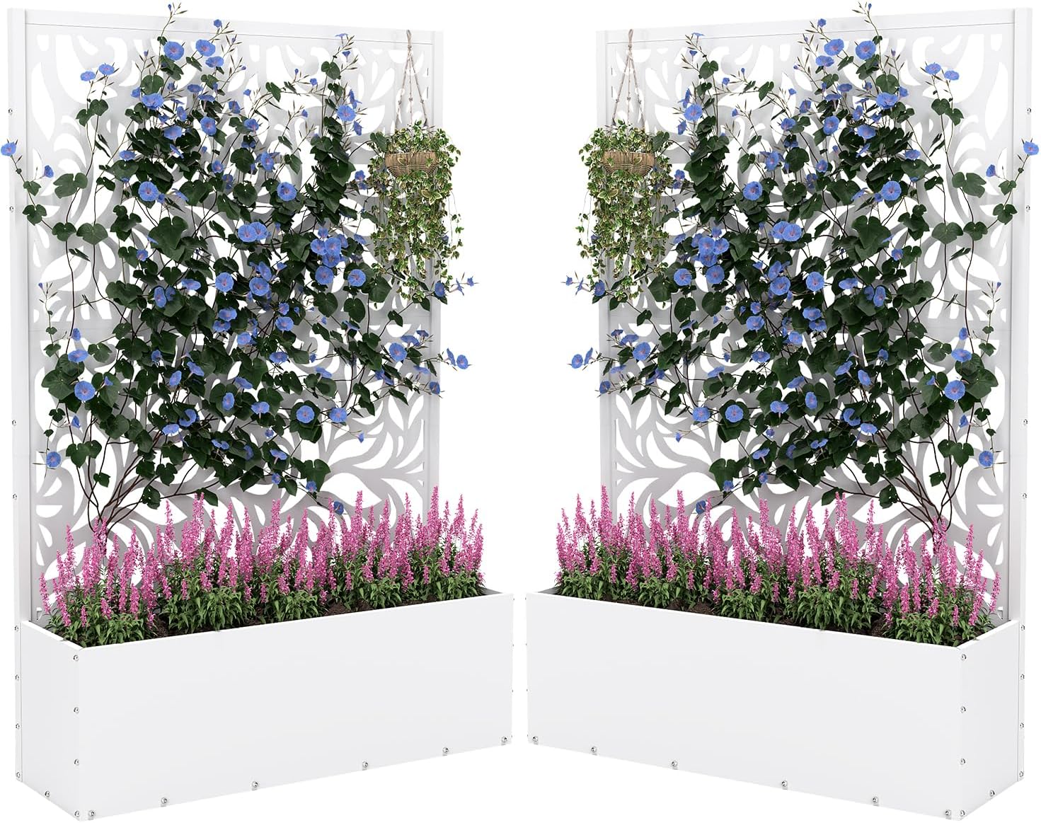 2PCS Metal Planter Box with Trellis,70.9"x47.2"x15.7" Raised Garden Bed with Drainage Holes, Privacy Planters for Outdoor Garden Bed for Climbing Plants,Vegetables,and Vines, White-Flower