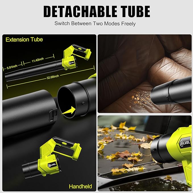 - 【LIGHTWEIGHT FOLDABLE DESIGN】 The battery-powered brushless leaf blower is lightweight, liftable with one hand easily, with a foldable handle for space-saving storage and a detachable design for easy transport. It has a wide range of applications, effortlessly handling everything from large-area fallen leaves and snow on lawns, roadsides, courtyards, etc., to fallen leaves on cars, dust in window gaps, and wood chips on workbenches.