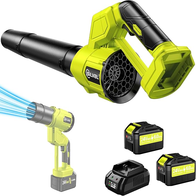 SILVEL Leaf Blower, 650CFM (200MPH) High Power Brushless Turbo, 24V Cordless Electric Blower with 2x6.0Ah Battery and Charger Lightweight for Lawn Care, Patio Cleaning, Fallen Leaves and Dust