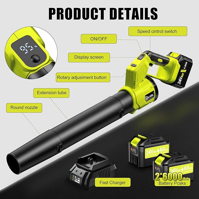 - 【FAST CHARGING DESIGN】This battery-powered blade blower is equipped with a fast charger that can charge in just 2 hours, making it convenient for your timely use. Additionally, this blade blower features overheat and overcharge protection. Once fully charged, it automatically stops charging, effectively protecting the battery, extending its lifespan, and ensuring your safety.