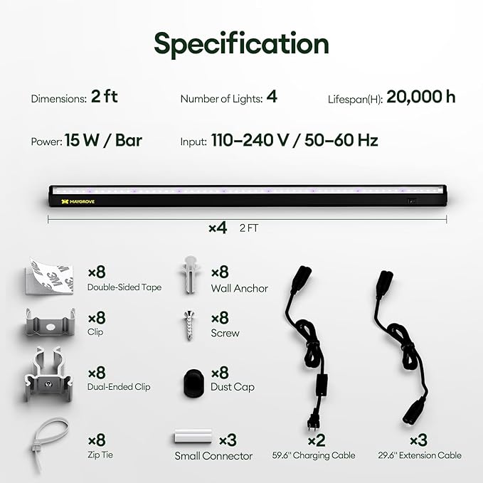 • Energy-Efficient, High Output: Each 2 ft grow light strip uses just 15W (60 W total per 4-pack) with 240 LEDs totally while delivering high PPFD for better light coverage; With optimized light distribution, these LEDs maximize efficiency and provide targeted support from seedlings to fruit