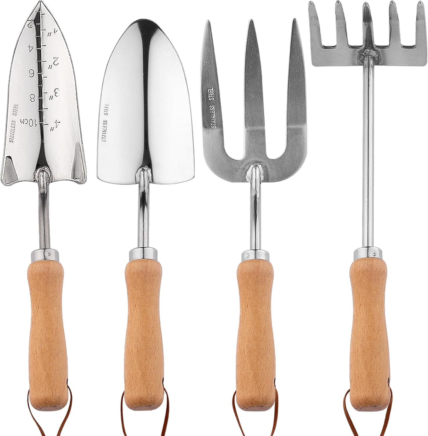 • 4 Piece Garden Tool Set - The garden tools set includes a garden trowel,a hand fork, a garden rake, and a transplanting hand shovel with graduated scale. Great gardening tools for weeding, digging, transplanting, planting, loosening soil, etc. The great lawn and hand tool set to meet most of your daily gardening needs.