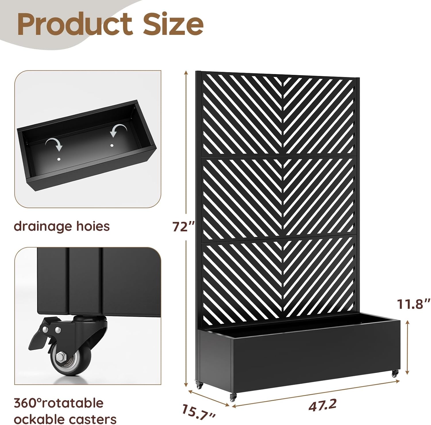 - Easy to move and superior drainage system: This vertical garden planter with trellis features 360° swivel casters, allowing you to effortlessly move the raised planter box anywhere. The privacy planters for patio also features an 11.8-inch deep planting bed with drainage holes, providing ample space for plant roots to thrive while preventing waterlogging and root rot. The planter box with trellis combine decorative appeal with practical functionality.