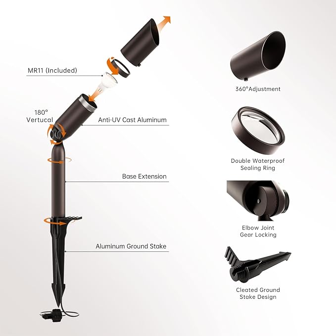 - ๐ซใAdjustable Detachable Spotlight Shade & 180ยฐ Precision Focusใ - The spotlight head of the low-voltage landscape light allows for 180ยฐ vertical and horizontal adjustment, featuring anti-slip gear mechanisms to ensure perfect alignment. You can direct the uplight to any desired angle without repositioning the fixture. The detachable, adjustable spotlight shade enables the light to reveal the natural colors of objects as you wish, perfect for highlighting flower beds, guiding footsteps.