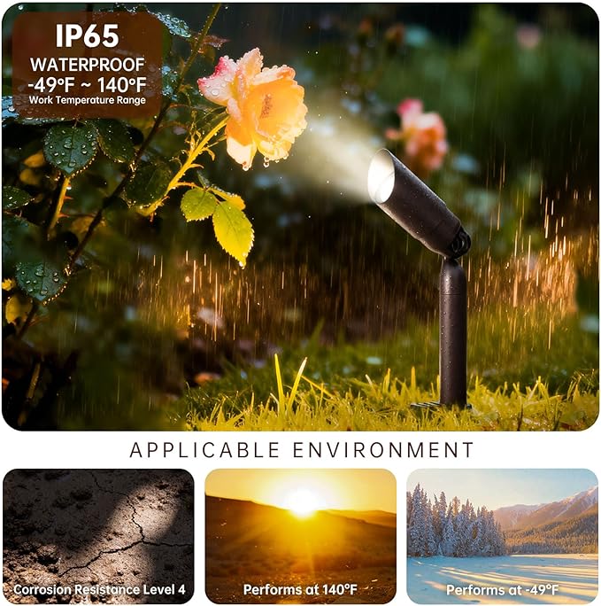 - โกใCast Aluminum Waterproof Spotlightใ - Low voltage landscape lighting engineered with die-cast aluminum housing and IP65 waterproof resistance, engineered to withstand harsh coastal climates and tropical conditions, with an operating temperature range of -49ยฐF to 140ยฐF. Experience exceptional outdoor lighting with our low-voltage landscape light made of durable cast aluminum, bringing lasting beauty to your yard.