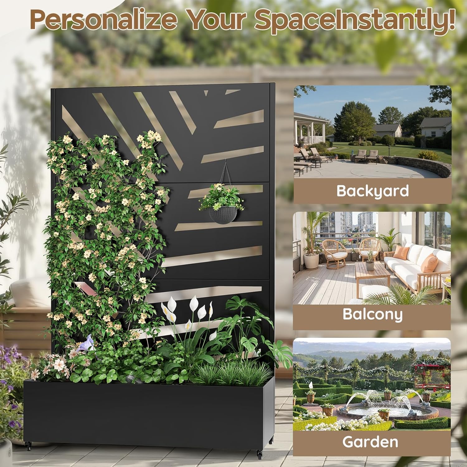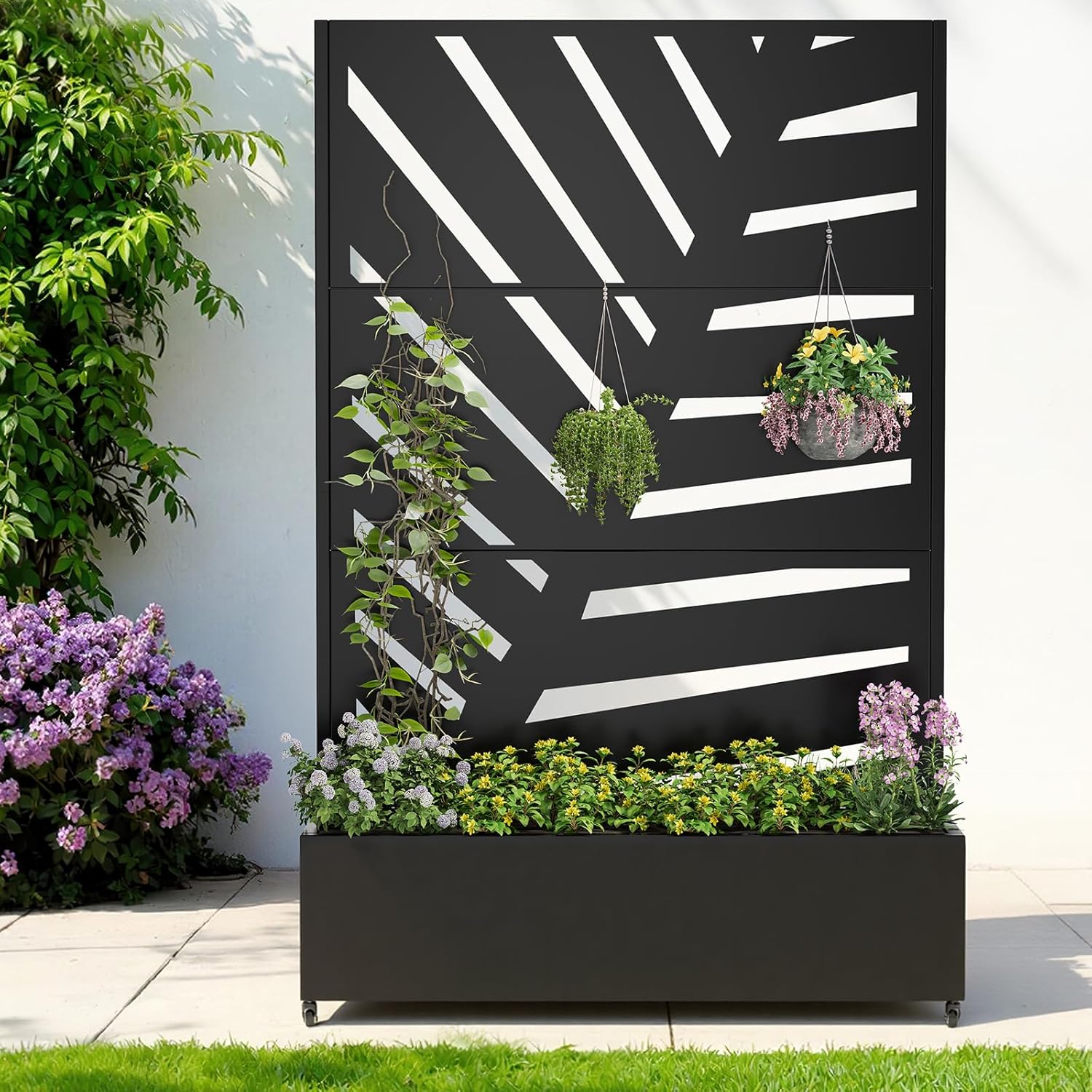 - Privacy Planters for patio: This metal raised garden bed with trellis cleverly combines privacy with aesthetic design. The privacy trellis with planter box transforms outdoor spaces into private retreats, effectively grouping various plants together while shielding personal areas. It serves as a natural privacy screen, achieving a perfect blend of practicality and beauty.
