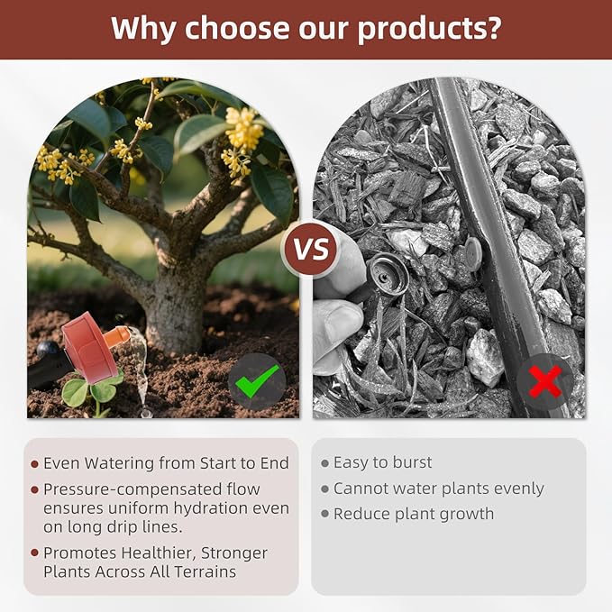 • Custom Flow Rates for Every Plant Type: Available in 0.25 GPH, 0.5 GPH, 0.75 GPH, 1 GPH, 2 GPH, 3 GPH and 4 GPH options. Choose low flow for delicate flowers, medium for vegetables, and higher flow for trees or shrubs. Optimize water delivery to each plant’s unique needs. !!! CHOOSE pressure-compensating drip irrigation emitters FROM 【Spalolen】!!!