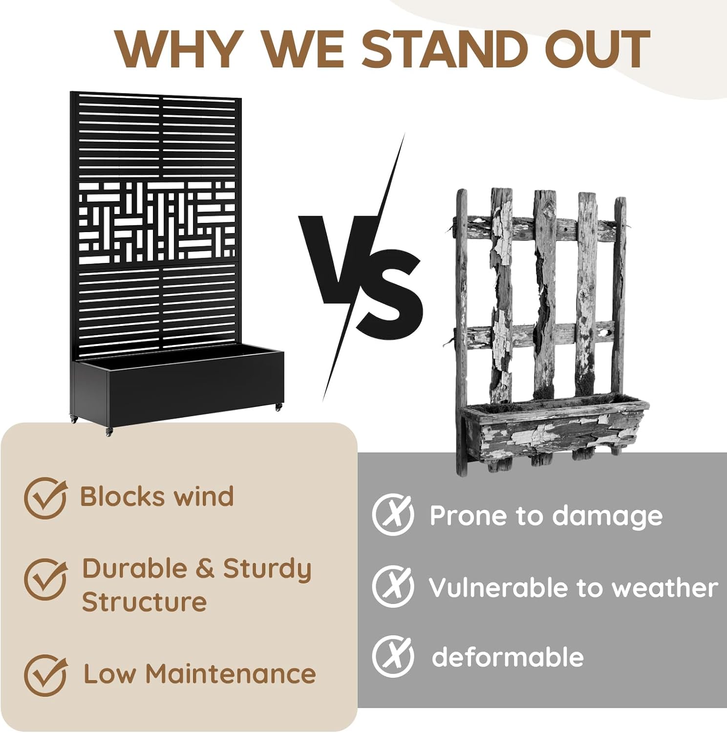 - High-Quality planter boxes outdoor with trellis: This raised planter box with trellis is crafted from premium galvanized metal and treated with a multi-layer reinforced coating. This privacy planters for patio sturdy and stable planter bed with trellis features waterproof and rust-resistant properties, withstanding all weather conditions to ensure long-lasting durability and reliable performance for extended outdoor use.