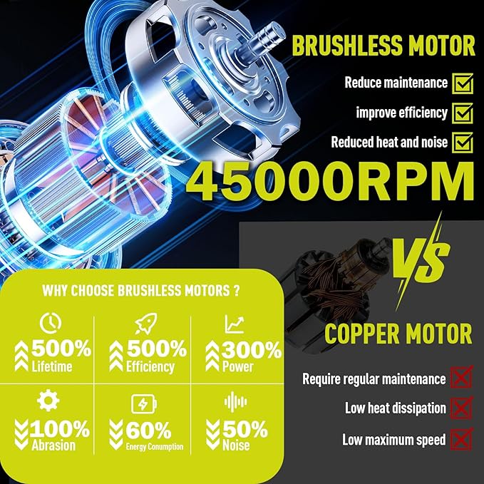 • 【Advanced Axial Fan Technology and High Performance Brushless Motors】: The Sihuird Leaf Blower uses a High Efficiency Brushless Motor, Maximum setting 45000 rpm, Adopting advanced axial fan technology, it provides greater air volume and more heat dissipation than traditional centrifugal fans. And equipped with 12 turbine blades and turbocharging function, providing higher airflow. Air volume and wind speed up to 680CFM and 190MPH.