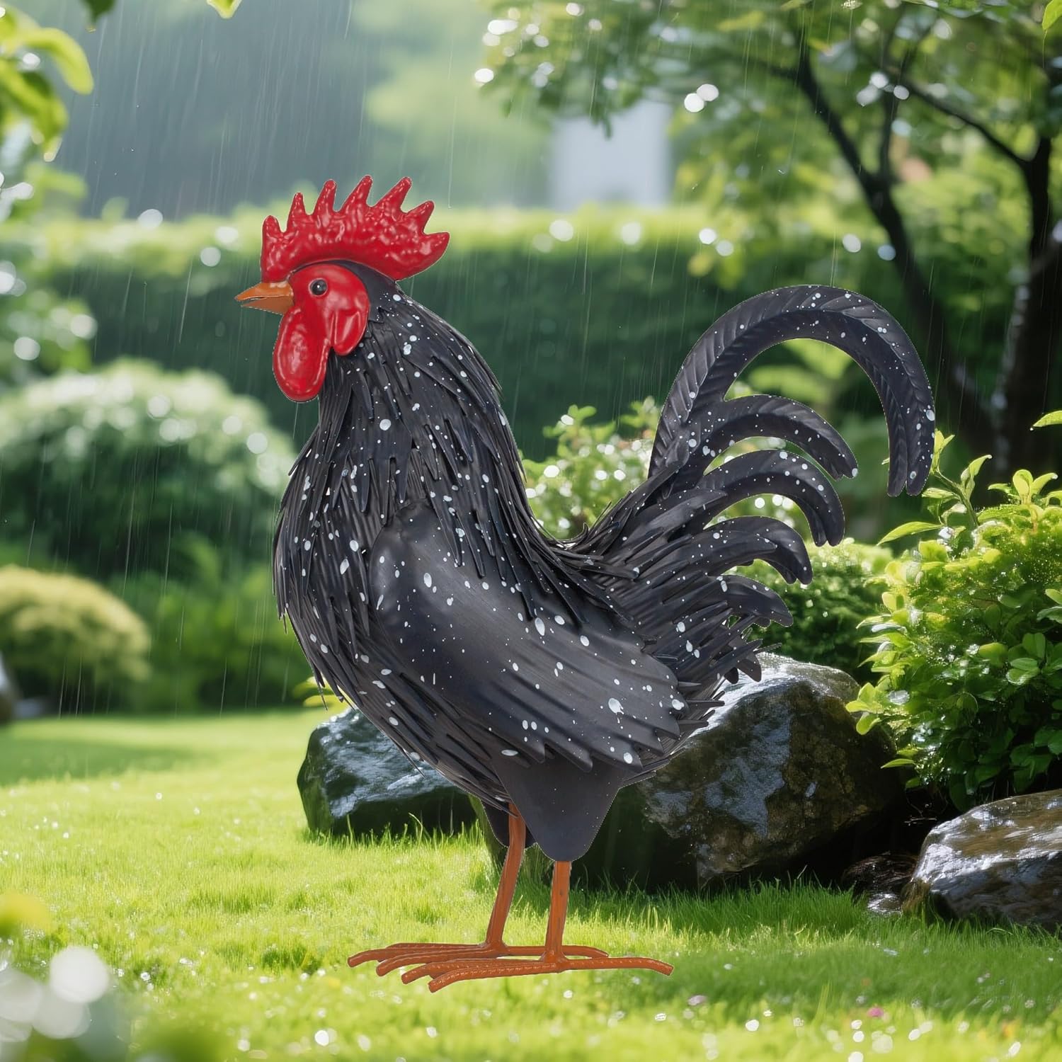Rooster Garden Statue Sculpture Metal Chicken Yard Decor Outdoor Figurines Patio Backyard Decoration (Black)