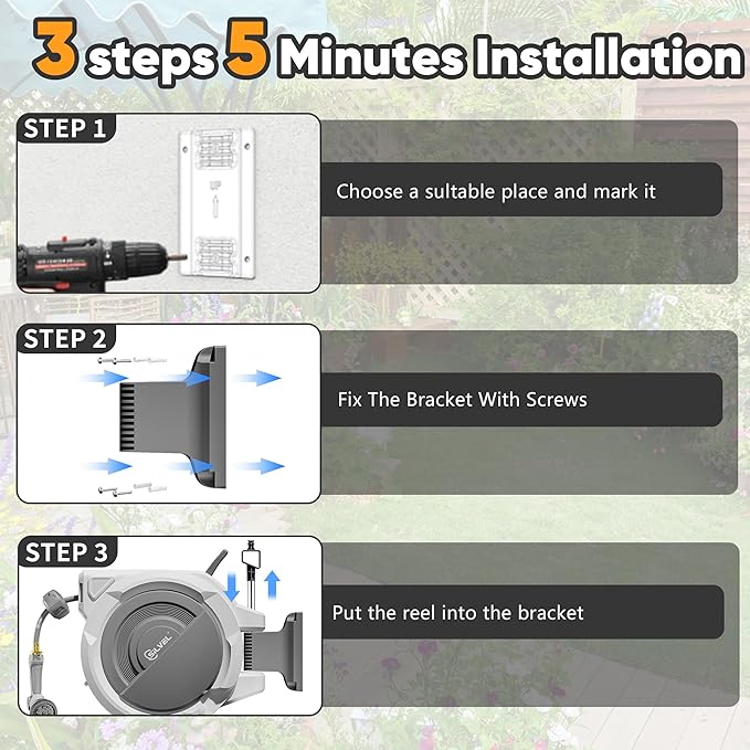 • 【180° Swivel Bracket for Multi-Angle Use】 Equipped with a heavy-duty 180° rotating bracket, the hose reel offers flexible, wide-range movement. Rotate it freely to reach every corner of your garden or yard, easily meeting all your multi-angle watering needs—from flower beds to patio plants—for unmatched convenience.