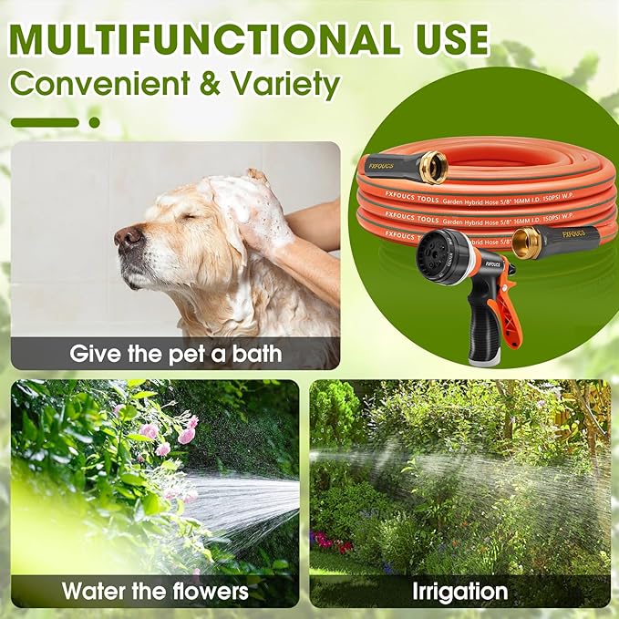 • The FXFOUCS Heavy-Duty Garden hybrid 5/8” Hose is not just a water hose; it's an essential tool for your patio and garden, offering flexibility and ease of use to support your gardening projects.