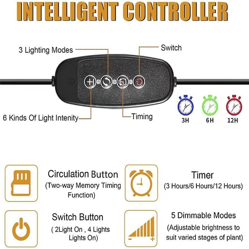 • Automatic Timer: This LED grow lamp has a circular storage timer function and conveniently set for 3, 6, or 12 hours based on your plant's requirements. After setting the time, it will automatically turn on and off at the same time the next day, no need to unplug/re-plug.