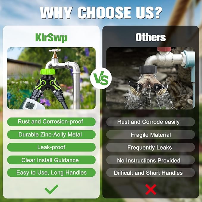 • Convenience and Inclusivity: KlrSwp garden hose splitter is simple and efficient to use, with just a glance, you can start or stop it in just one second, no fumbling required. Even if your hands are stiff, you live with arthritis or neuropathy, or you're wearing thick gloves (like for outdoor work for gardening, washing the car, or cold weather), you'll still control it easily, with zero extra effort.
