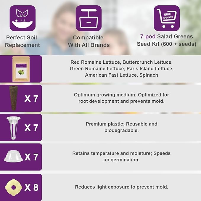 Salad Greens Seed Pod Kit for AeroGarden, idoo with Red and Green Leaf, Romaine and American Fast/Buttercrunch/Paris Island Lettuce, Spinach - Hydroponics Supplies for Most Brand (7-pod)