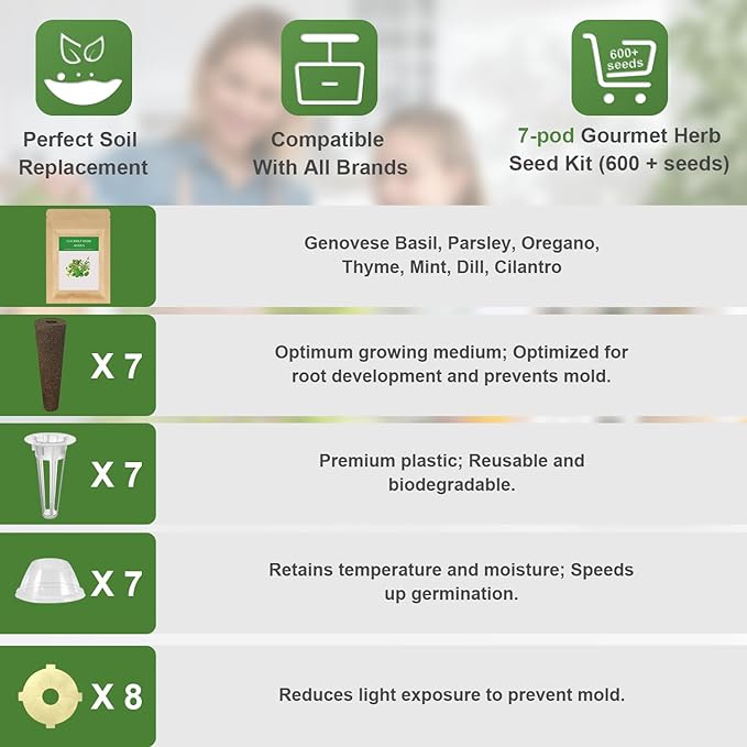 • 【Complete Kit】Everything you need to grow herbs indoors: 7 varieties of herb seeds (Basil, Parsley, Thyme, Mint, Cilantro, Dill, Oregano), sponges, domes, baskets, labels & nutrients.