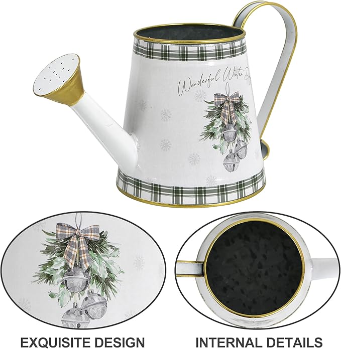 • 【FESTIVE CHRISTMAS DESIGN】This watering can features a charming white color with gold - toned accents on the spout and rim. Adorned with a green and white plaid pattern near the top and bottom, it also showcases a beautiful wreath with bells in the center. The text "Wonderful Winter Days" adds a touch of holiday cheer, making it a perfect addition to your Christmas decor.