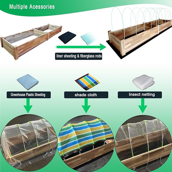 • Package Included: 1 red cedar planter box (8ft×3ft×9in), 1 garden netting, 1 shade cloth, 1 plastic sheeting, 1 liner sheeting, 10 fiberglass rods with 30 plastic clips.