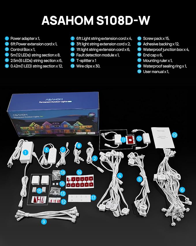 ASAHOM Permanent Outdoor Light Pro S108D, 200FT with 144 RGBCW LEDs, WLED Integration, AI Lighting, 30000 Lighting Effect Combination, IP67 Waterproof for Halloween Christmas Daily Decor, White