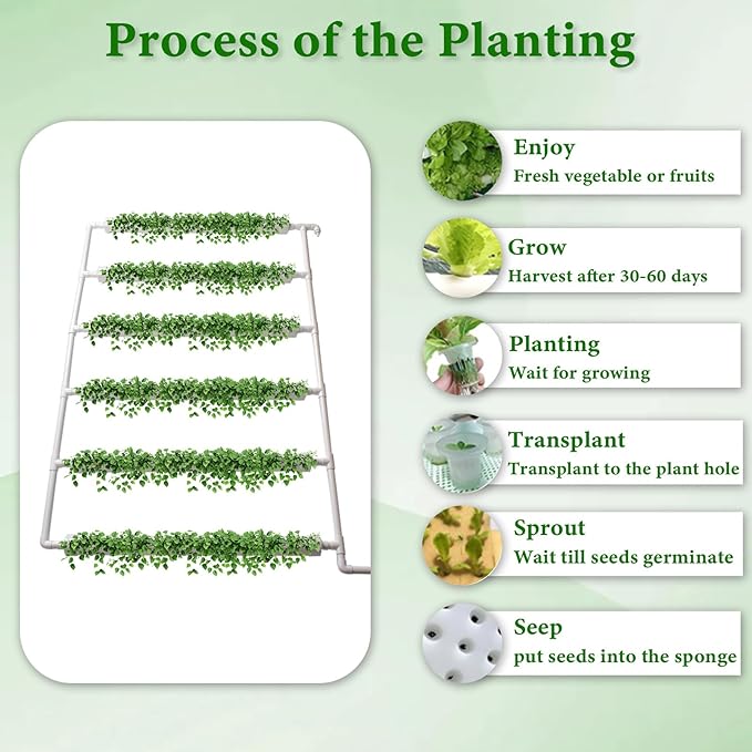• ▲TIMED SYSTEM: This PVC hydroponic gardening system kit features a timed circulation system; the timer's default setting runs the pump for 5 minutes every 30 minutes to enable NFT; circulation mode can be manually or automatically set as needed; this not only extends pump lifespan, saves nutrient solution, but also promotes vegetable growth