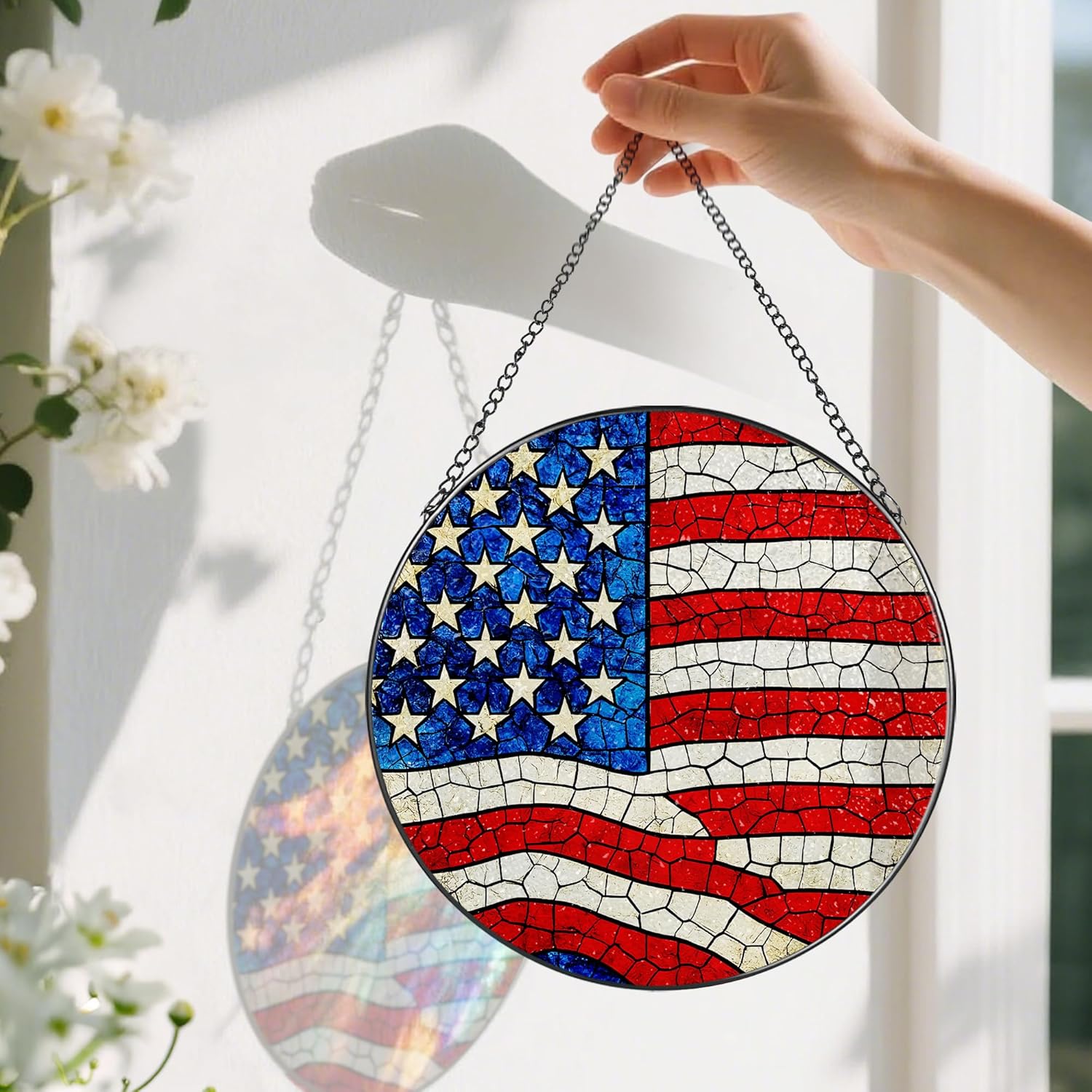 Stained Glass Window Hanging, Pauyadu 8 Inch American Flag Stained Glass Suncatcher, Patriotic Home Decor, Window Decor, USA Flag Gift Ideas, Patriotic Themed Gifts, Gifts for Women and Men